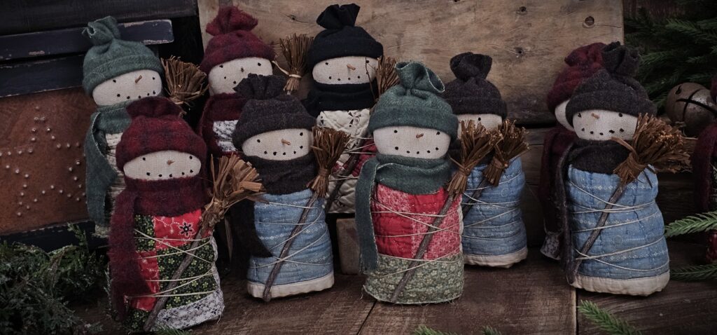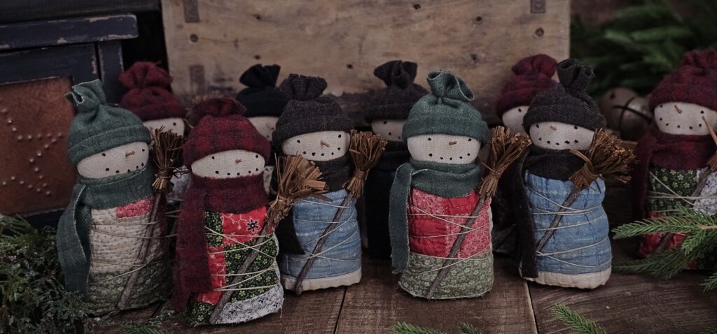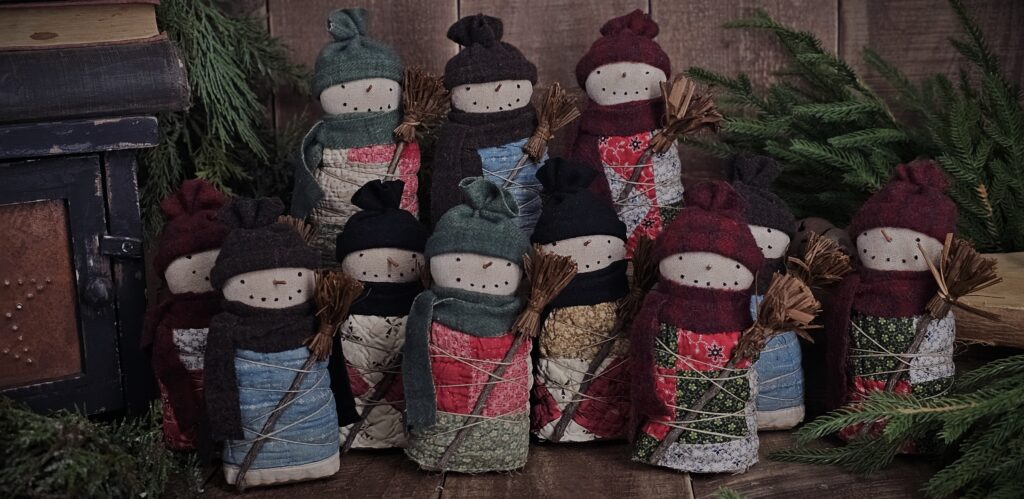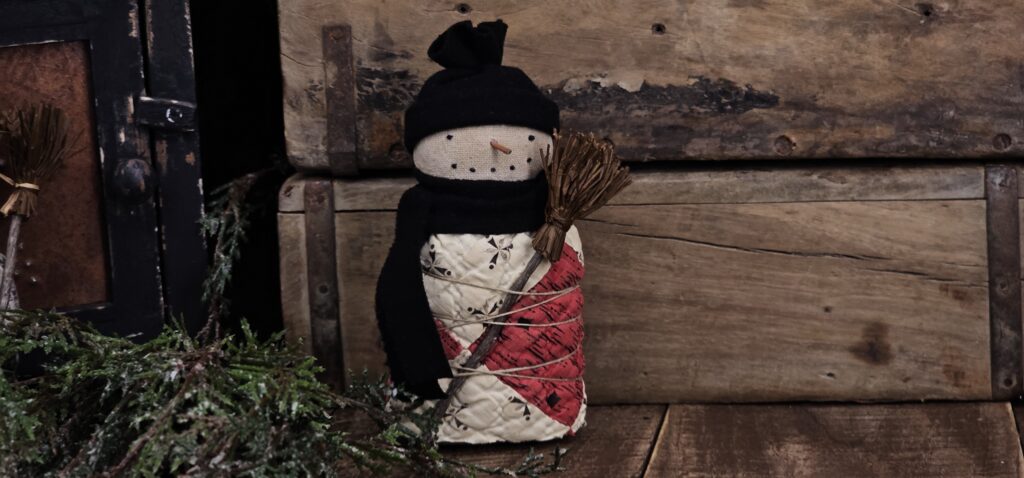 Bring cozy winter charm to your home with this Primitive Quilted Snowman Shelf Sitter, a handmade folk art treasure crafted from authentic antique quilt pieces. Each snowman features a hand‑stitched face, twig nose, wool hat and scarf, and a weighted base for easy display on shelves, tiered trays, or mantels. Perfect for farmhouse Christmas décor, this rustic holiday accent adds heirloom warmth and nostalgic character to any seasonal vignette.