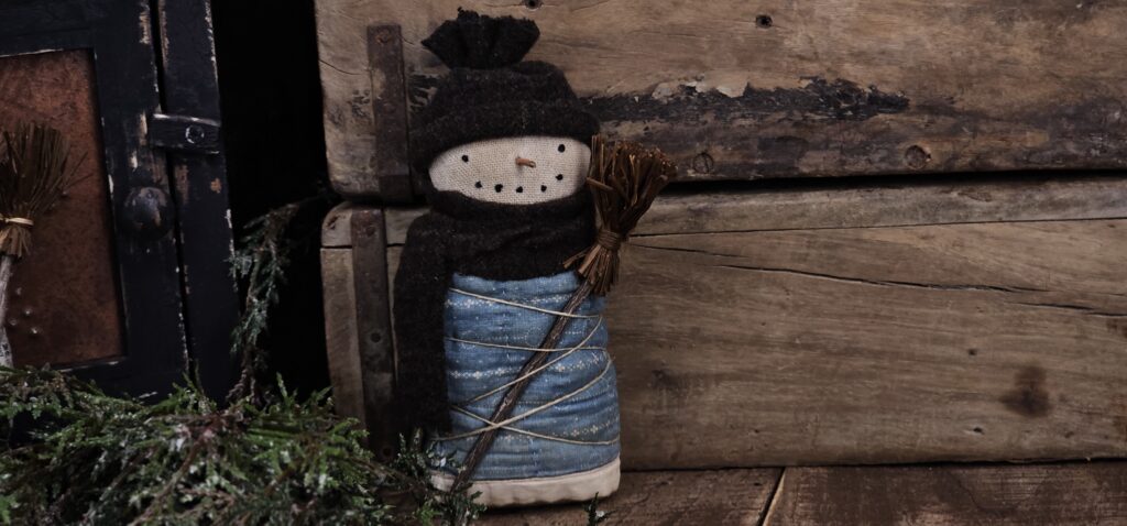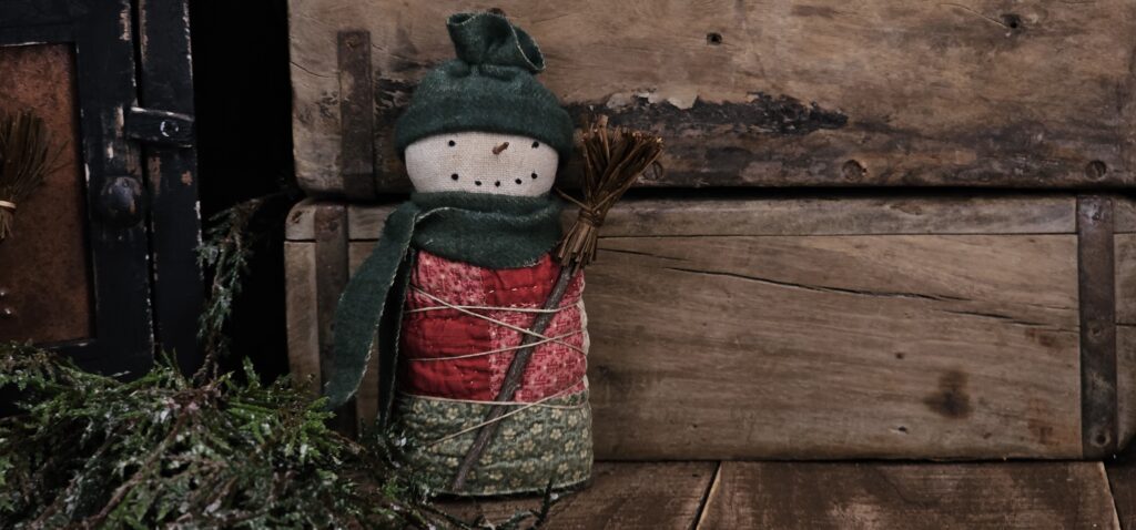 Handmade primitive quilted snowman shelf sitter, rustic farmhouse Christmas décor with antique quilt body, wool hat, and twig nose