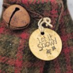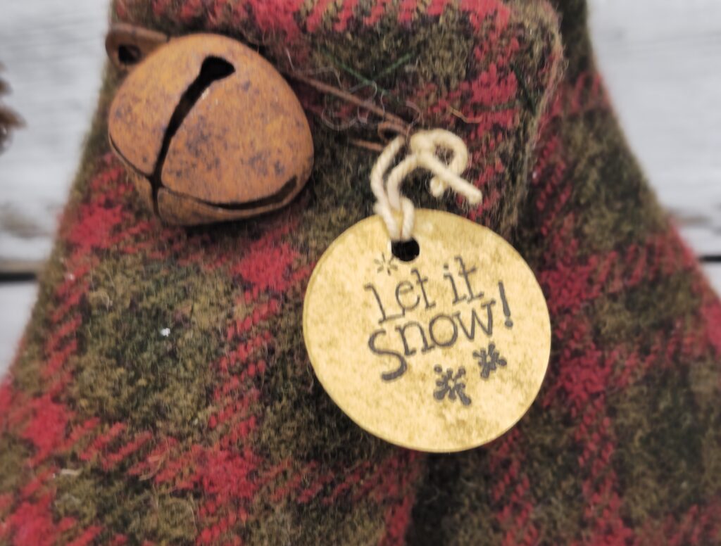 • Pine sprays, vintage candy cane, rusty jingle bell, and aged “Let It Snow” tag.