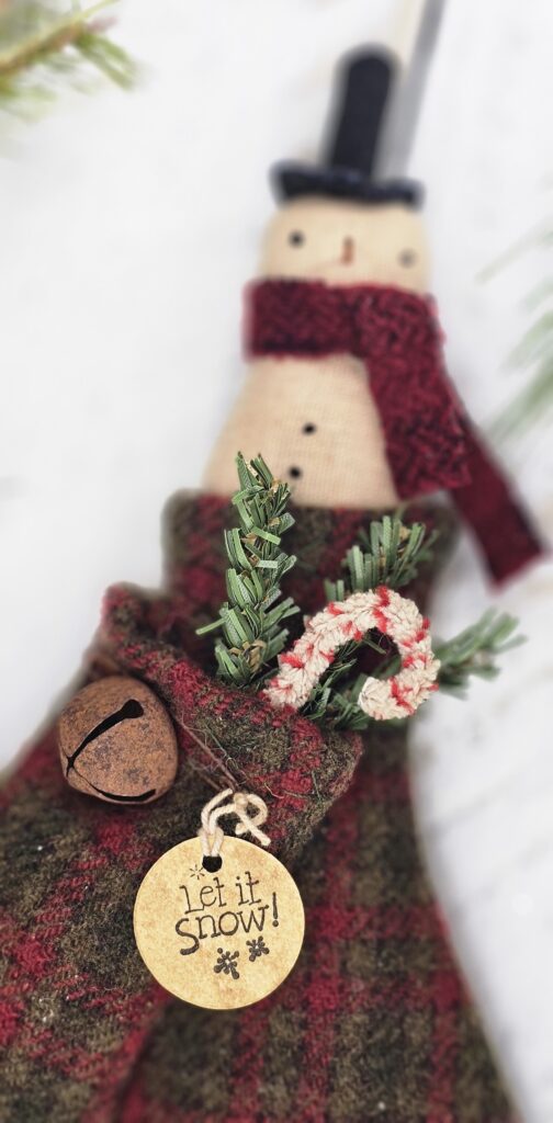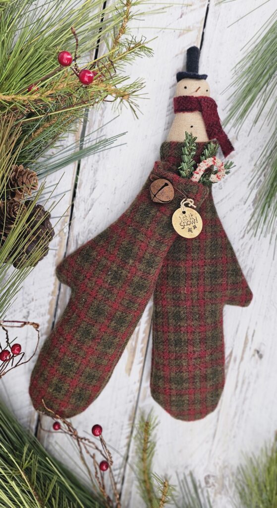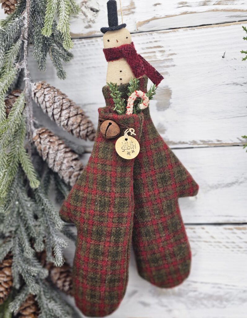 • Alt Text (≤125 characters): Handmade primitive wool mitten snowman door greeter, rustic farmhouse Christmas décor with pine sprays and vintage candy cane
