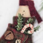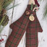 Welcome guests with cozy charm using this Primitive Wool Mittens Snowman Door Greeter, a handmade folk art accent perfect for farmhouse Christmas decorating. Crafted from 100% wool in festive red and pine green, this door hanger features a hand‑stitched snowman with a wood nose, wool scarf, and black wool hat. The companion mitten is filled with pine sprays and a vintage chenille candy cane, accented with a rusty jingle bell and safety pin for authentic primitive character.