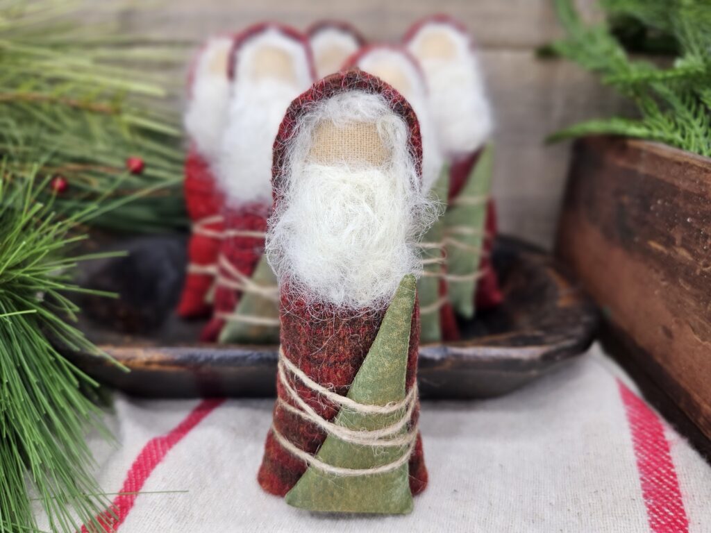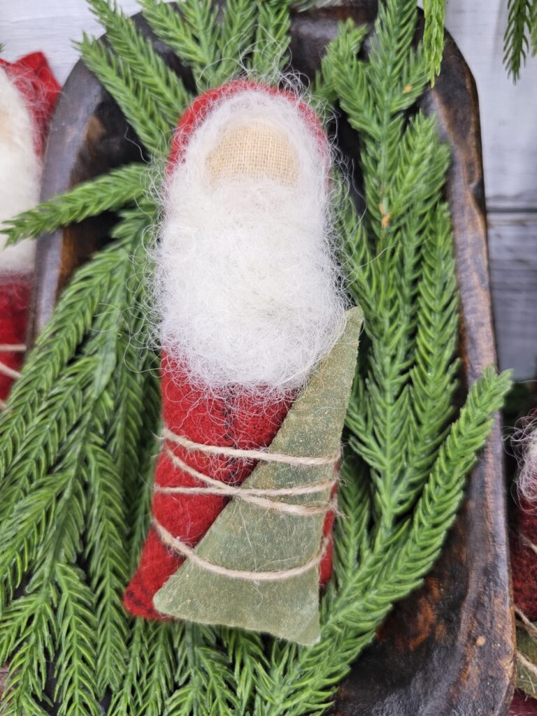 This Santa tuck is one of my favorites this year. They are made from hand-dyed osnaburg fabric for his body. He sits in a red 100% wool sack. He has a hand-painted Christmas tree at his front that has been rubbed with Christmas holiday spices and tied on with hemp twine. His hair and beard have been needle-felted by hand onto his face and are made from 100% English Leicester Sheeps Wool. He is such a charming addition to any primitive/country home for the holidays. I love how simple they are and how they can be tucked anywhere in your home for some added holiday charm. I am happy to add a hanger to this Santa if you want to hang him on your tree or anywhere else. Please choose that option at check out at no extra charge.